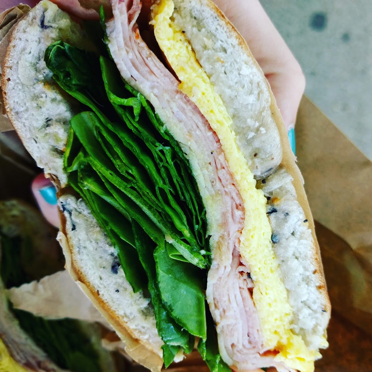 Breakfast Sandwich Ham Scrambled Egg and Spinach on a Blueberry Bagel